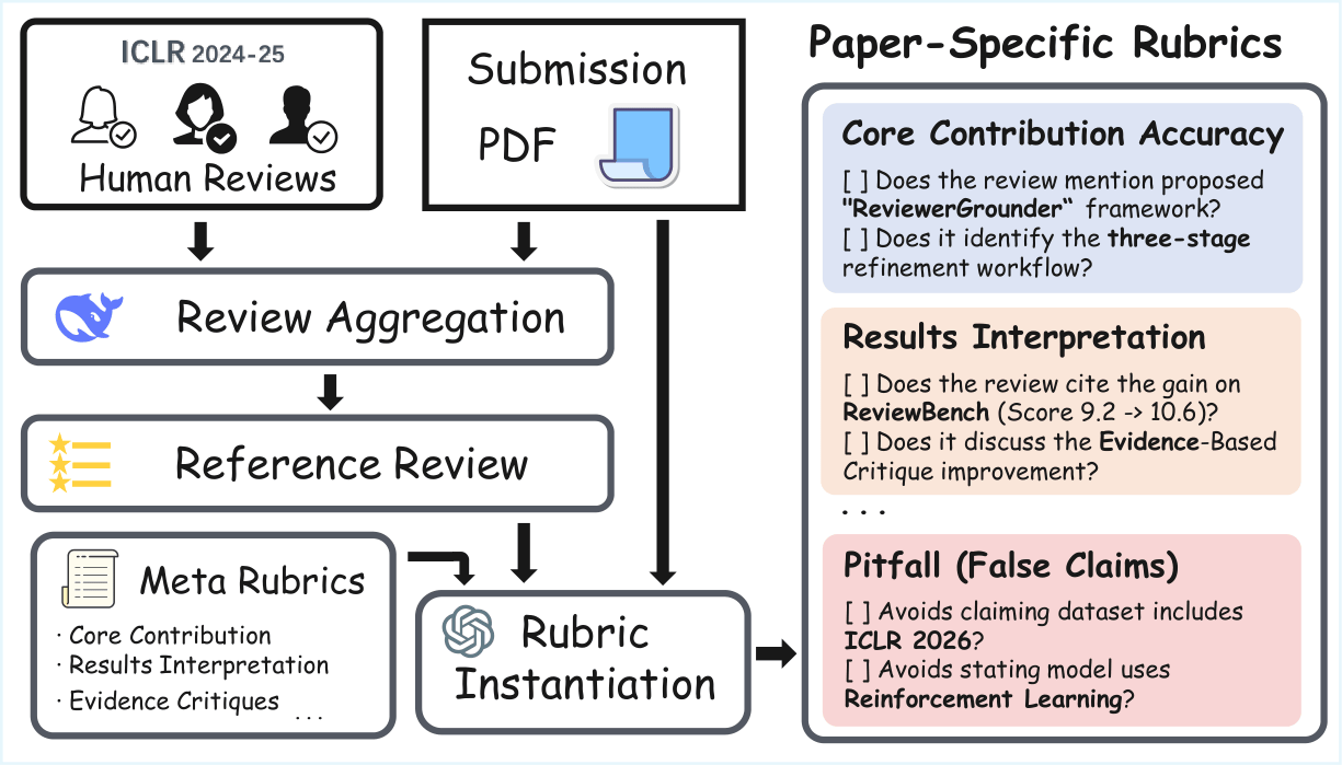 Overview of the ReviewBench construction pipeline. For each paper, paper-specific rubrics are instantiated by an aggregated reference review, the submission PDF, and meta-rubrics.