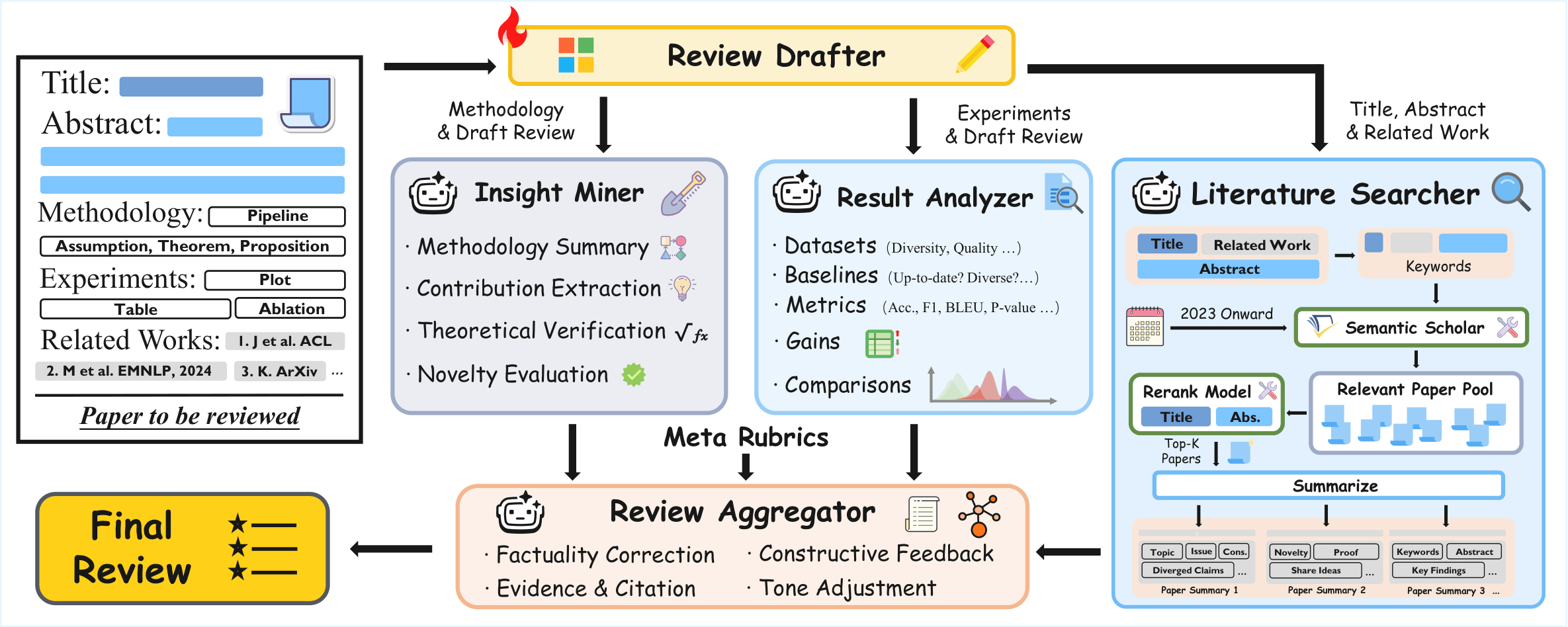 Stage II: Multi-dimensional Review Grounding. Three specialized agents collaboratively enrich the draft: Literature Searcher $\mathcal{S}$ situates the submission within contemporary literature via Semantic Scholar API and reranking; Insight Miner $\mathcal{M}$ consolidates conceptual understanding and refines method-focused critiques; Result Analyzer $\mathcal{A}$ strengthens empirical grounding by examining experiments, datasets, baselines, and quantitative evidence.