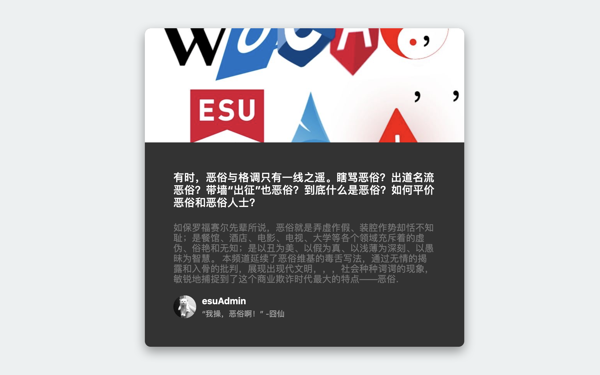 本频道延续了恶俗维基的毒舌写法,通过无情的揭露和入骨的批判,展现出现代文明,,,社会种种谔谔的现象,敏锐地捕捉到了这个商业欺诈时代最大的特点——恶俗.`