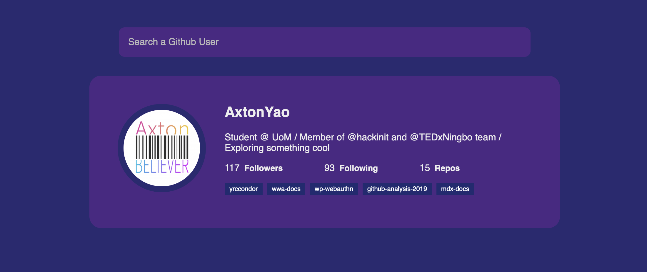 <input type="text" id="search" placeholder="Search a Github User">